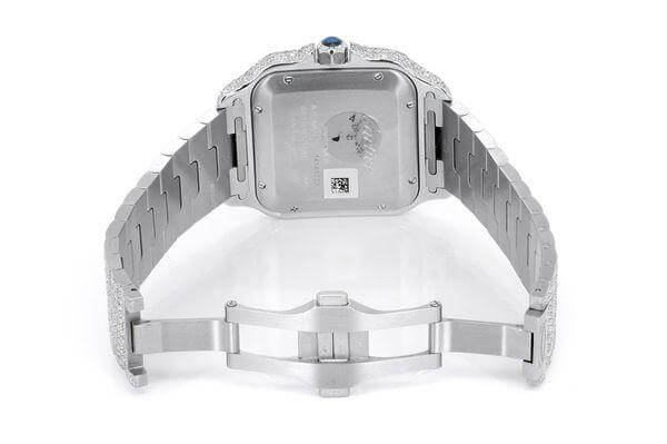 When it comes to Cartier watches, there is a popular style known as the “bust down” watch. This style showcases a luxurious and extravagant look by covering the watch with diamonds or other precious stones. CARTIER SANTOS 100 XL WATCH WITH DIAMONDS Santos watch, large model, mechanical movement with automatic winding 1847 MC. Steel case, 7-sided crown adorned with a faceted synthetic spinel, silvered opaline dial, blued steel sword-shaped hands, sapphire crystal. Steel bracelet with “SmartLink” size setting system. Second strap in calfskin, with interchangeable steel folding clasp. Both bracelets are equipped with the “QuickSwitch” interchangeability system. Case width: 39.8mm, thickness: 9.08mm. Waterproof up to 10 bars (~ 100 meters).